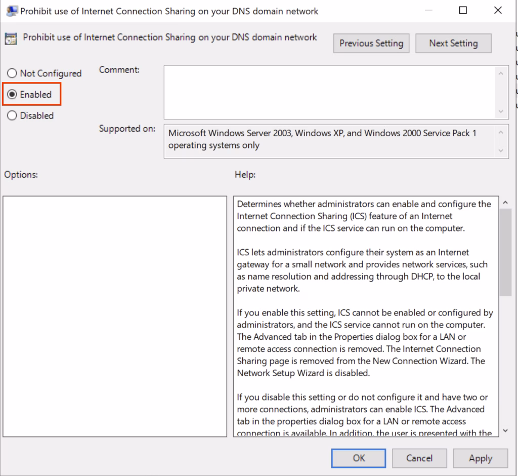 - In the right pane, find and double-click Prohibit use of Internet Connection Sharing on your DNS domain network.