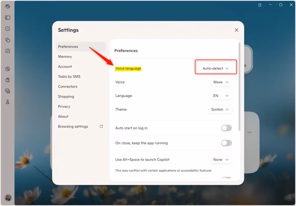 What happens when you change the voice language? Copilot will speak to you in the language you choose instead of trying to auto-detect it.