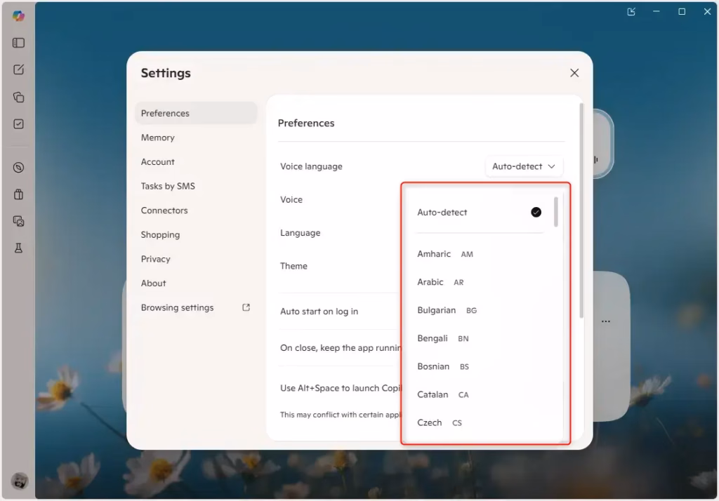 Right now, Copilot is set to auto-detect your voice language by default. But you can tell it to always use a specific voice language if you want.