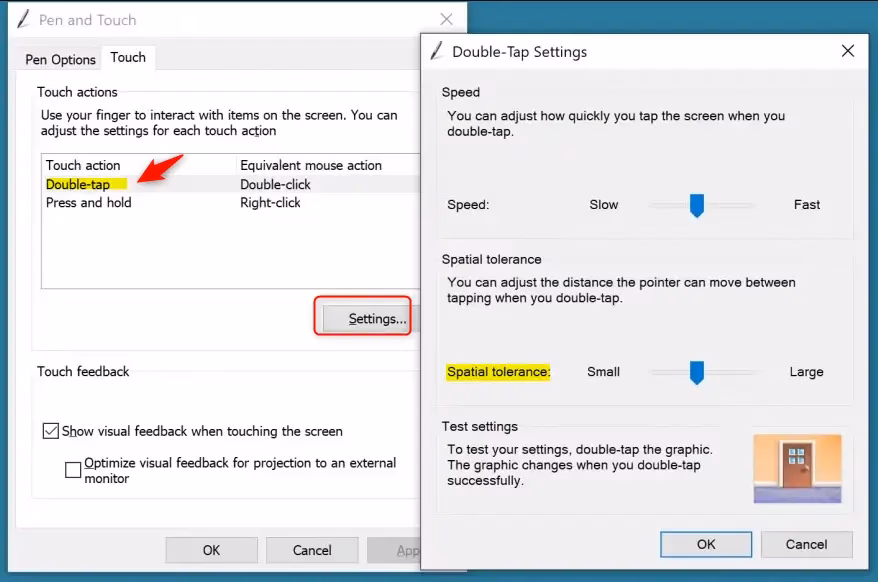- Move the Spatial tolerance slider left for a smaller distance or right for a larger distance. Choose what works best for you. Then click OK. You can double-tap on the door graphic under Test settings to test your current double-tap setting.