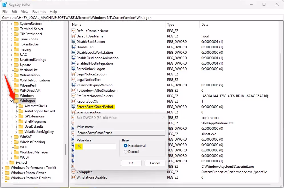 The screen saver grace period is the delay between when your screen saver locks and when it requires a password. By default, it’s 5 seconds. You can change it by editing the Windows Registry. Open Registry Editor, navigate to HKEY_LOCAL_MACHINE\SOFTWARE\Microsoft\Windows NT\CurrentVersion\Winlogon, and modify or create the ScreenSaverGracePeriod entry. Enter any number between 0 and 2147483 seconds. A value of 0 means you need a password immediately when the screen saver starts, which is more secure.