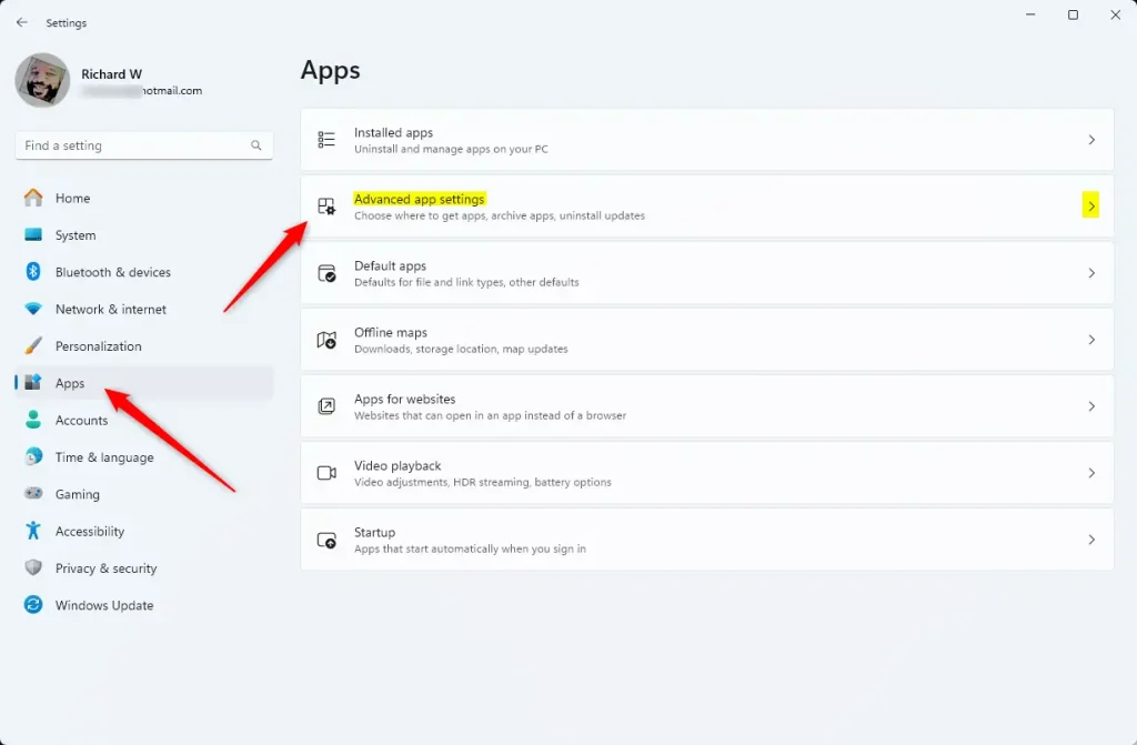 - Click on Apps on the left side. Then click on Advanced app settings or Apps & features > More settings on the right side. (see screenshot below)
