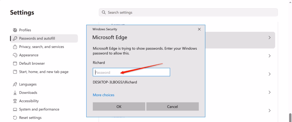 - [Requires admin privileges] Enter your Windows account credentials to authenticate yourself and approve showing passwords.