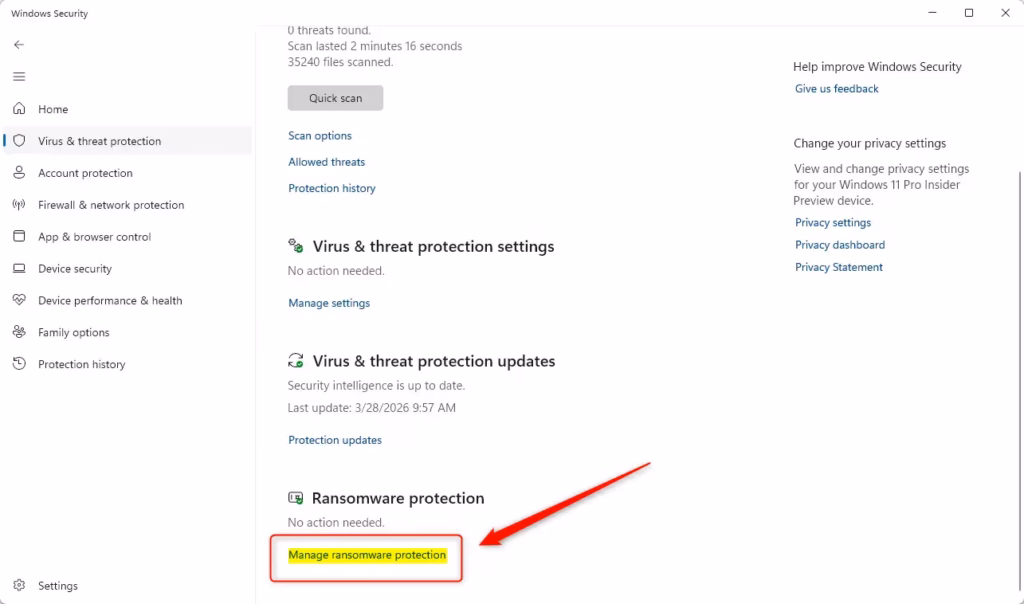 - Click Manage ransomware protection under Ransomware protection, OR