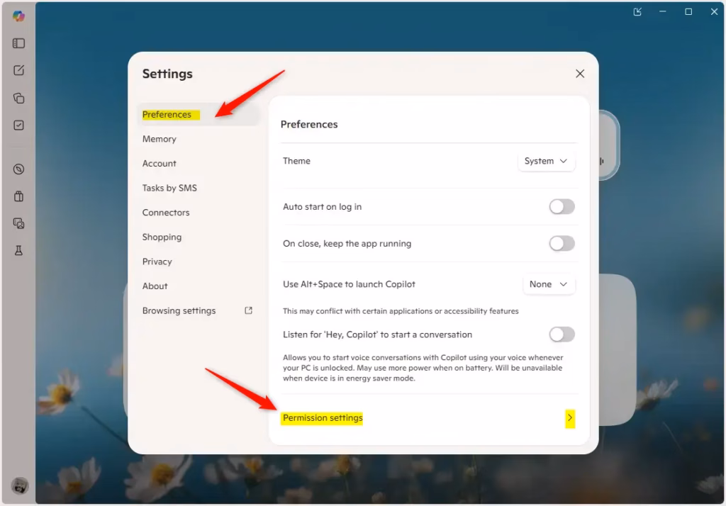 - Click or tap Preferences on the left. Then click or tap Permission settings on the right side.