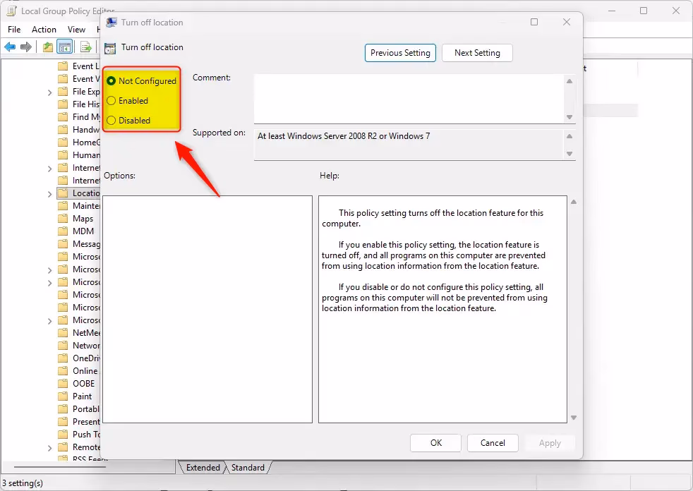 4. To Enable location services, select Not Configured and click OK.
