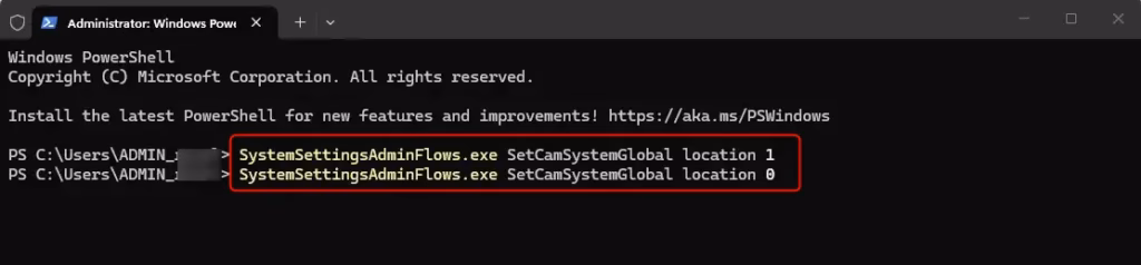 To turn off: SystemSettingsAdminFlows.exe SetCamSystemGlobal location 0