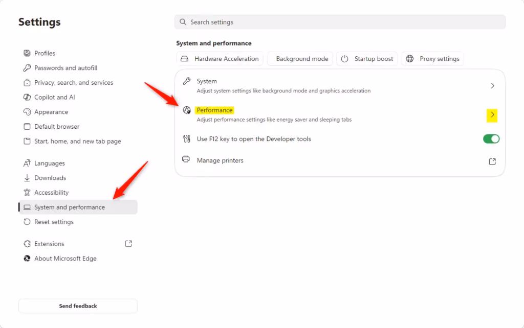 - Click System and performance in the left pane. Then click Performance in the right pane.