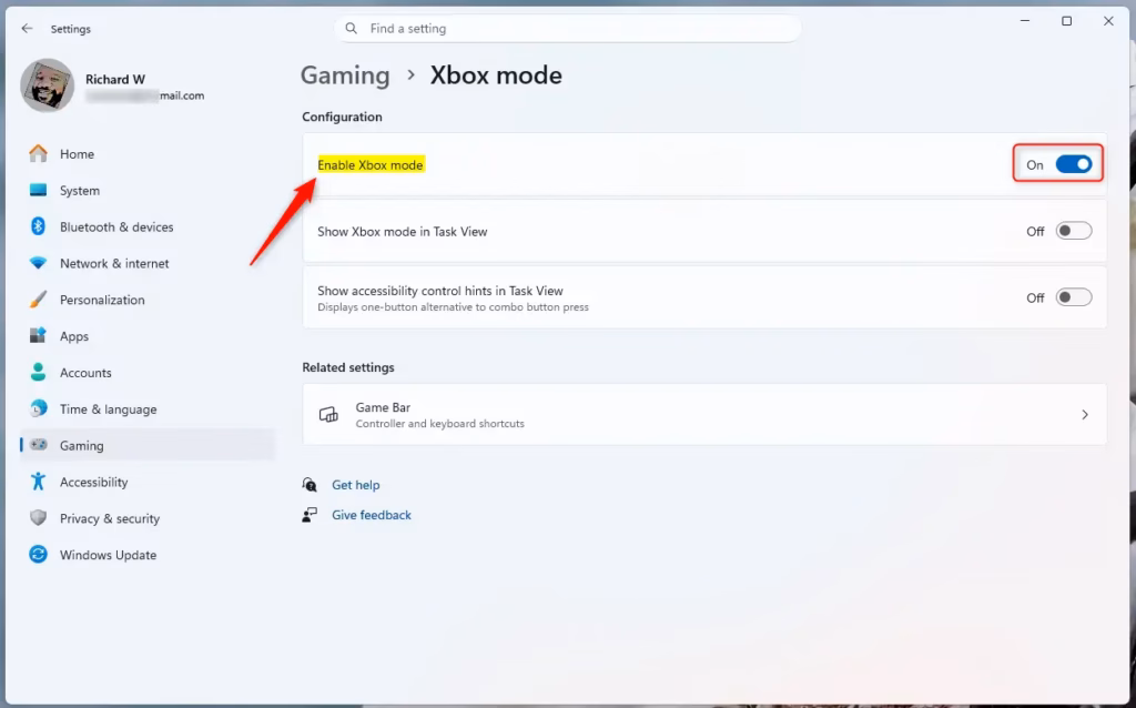 Once Xbox Mode is enabled, you can enter it anytime by pressing Win + F11. Press it again to exit.