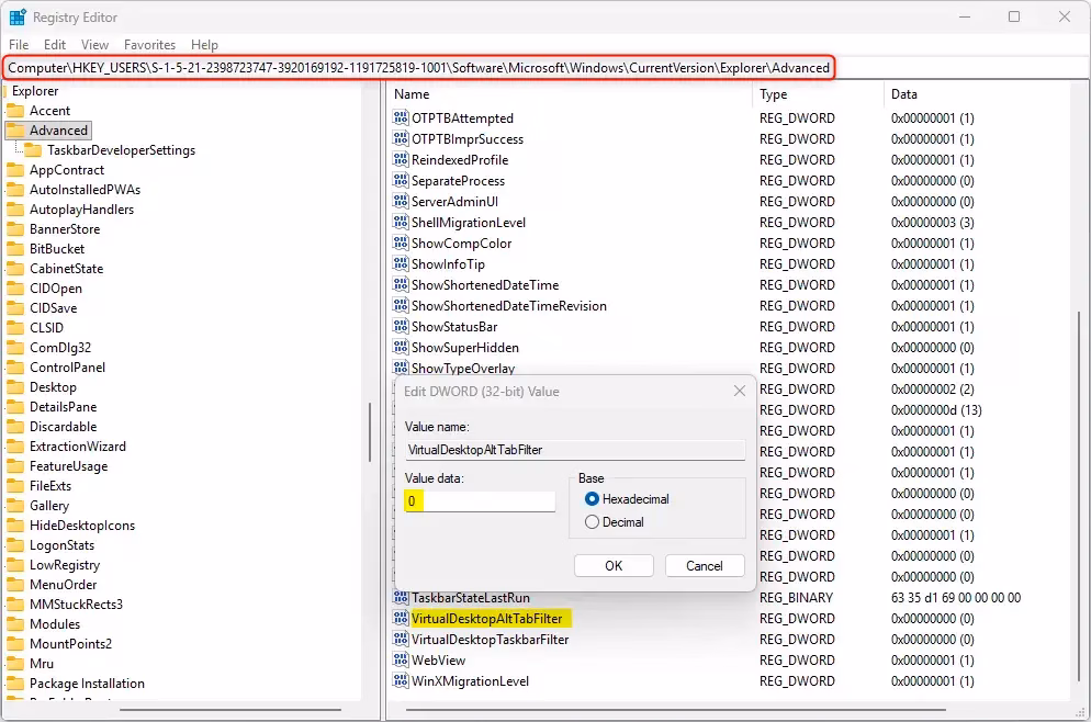3. In the right pane, find VirtualDesktopAltTabFilter. Double-click it to edit it.