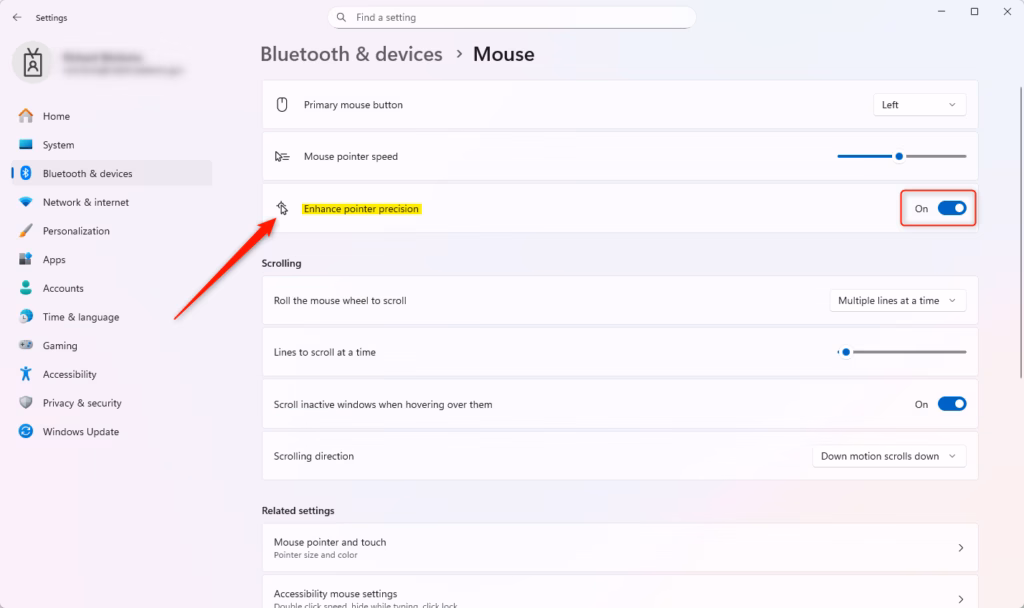 - Under Motion, turn Enhance pointer precision On (default) or Off depending on what you want.