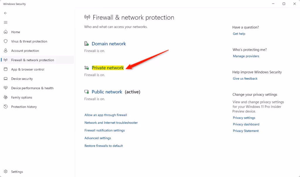 - Choose the network type you want to change (Domain, Private, or Public). You’ll see which one is active next to it.